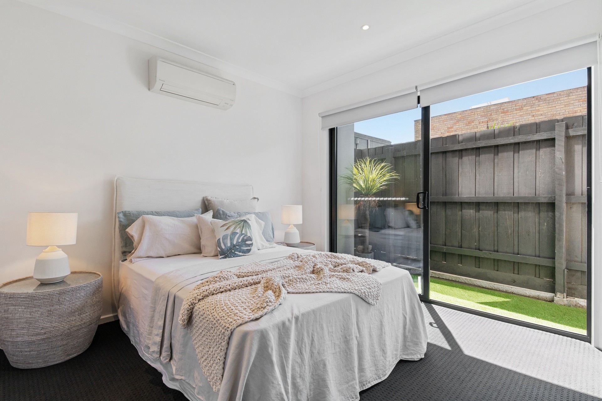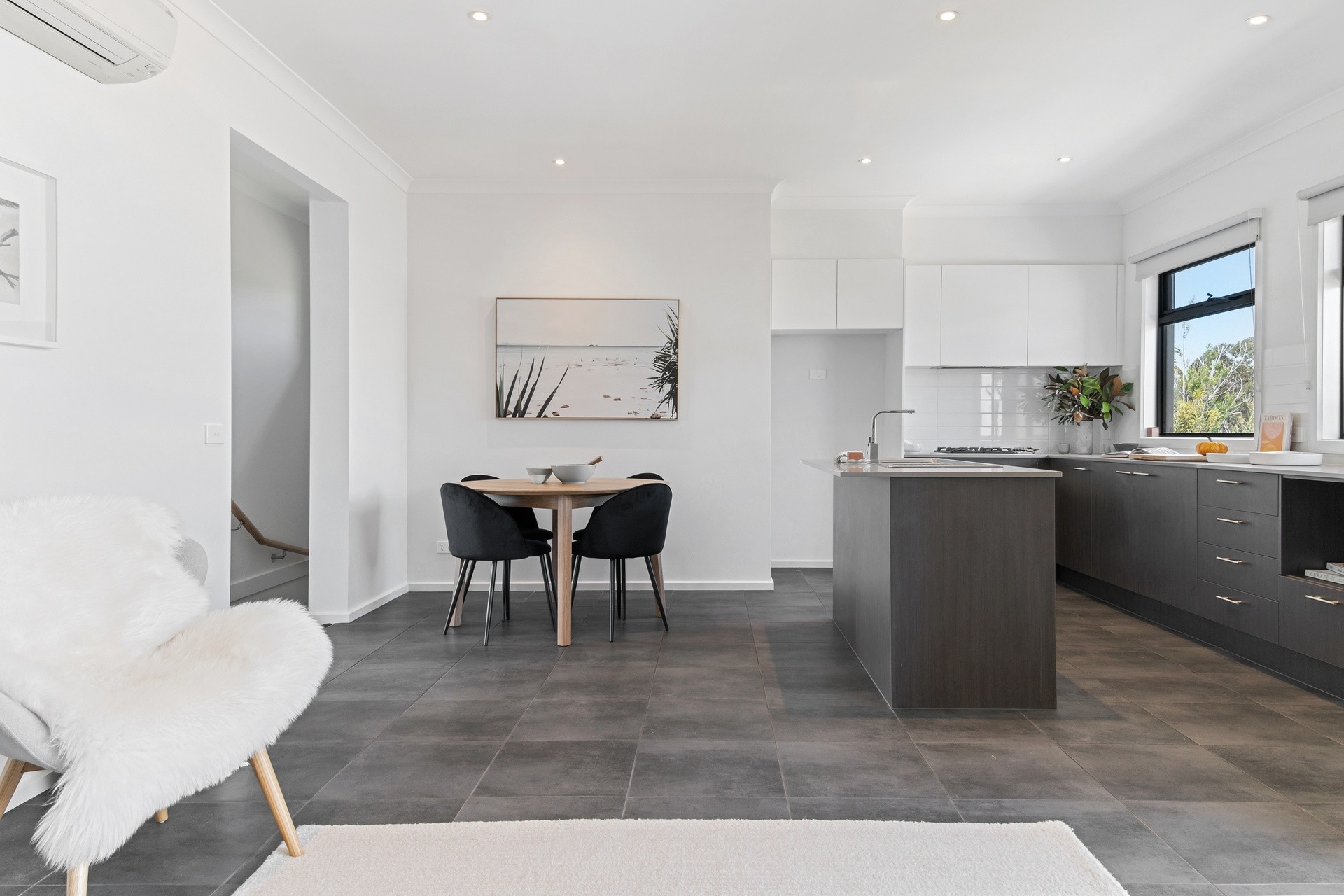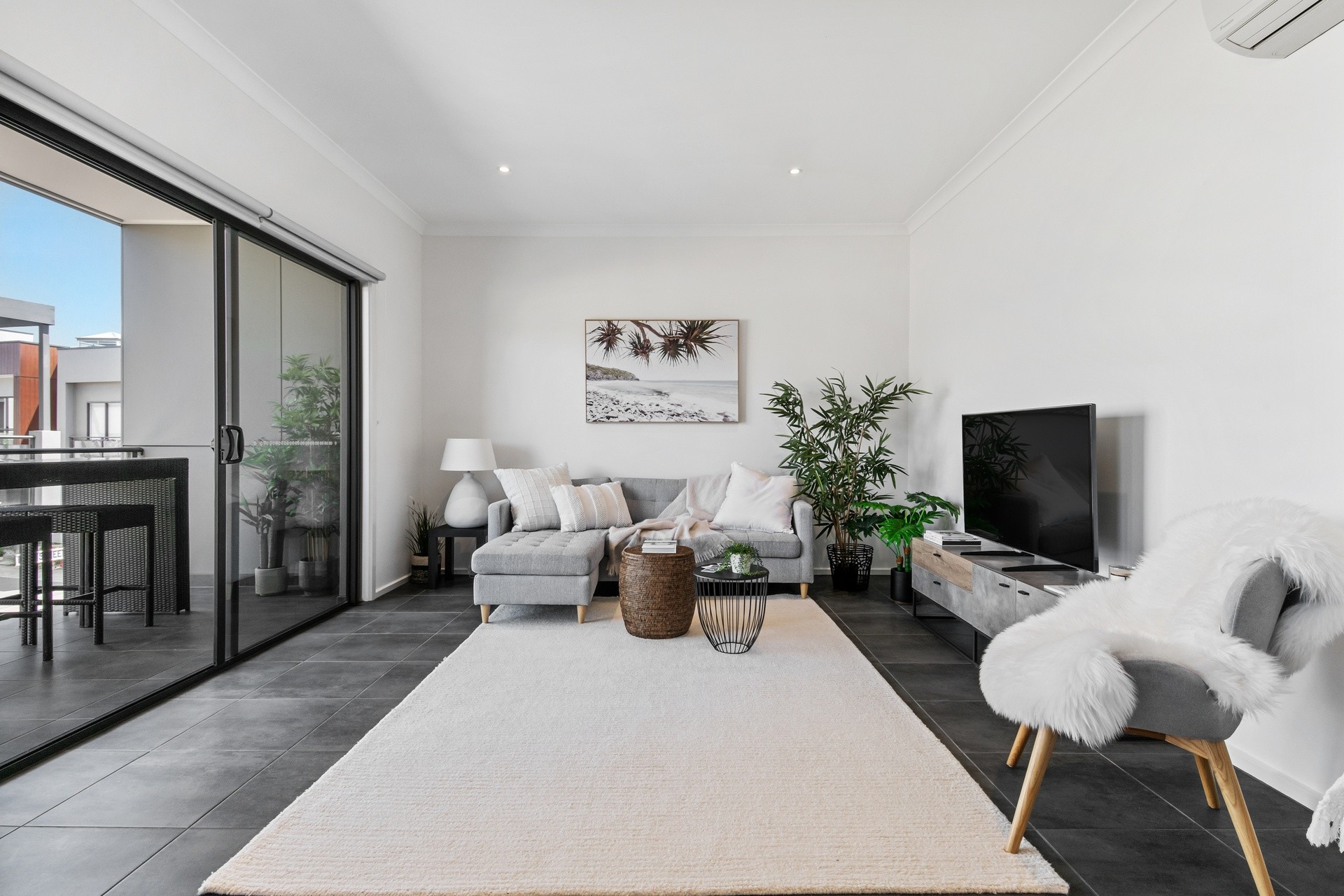 Sliding doors extend the living area to a sheltered balcony, providing exceptional interior/exterior connectivity for hosting guests or relaxing with a drink in summer.